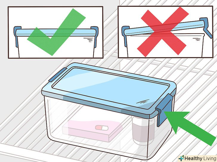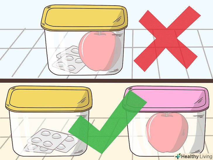 Зберігайте вітаміни в щільно закритому контейнері.переконайтеся, що ви добре закрили кришку, щоб уникнути проникнення вологи. Якщо залишити коробку з вітамінами відкритою в холодильнику, вони напевно швидше прийдуть в непридатність через вологу.[9]- Зберігайте контейнер у недоступному для дітей та домашніх тварин місці.