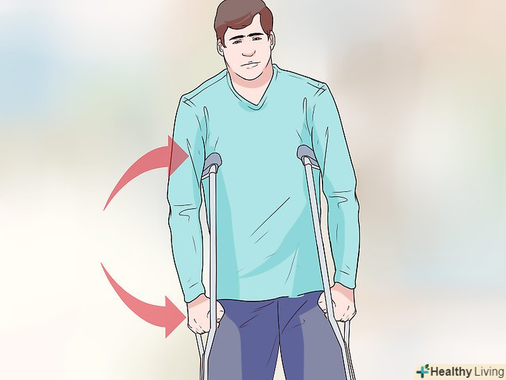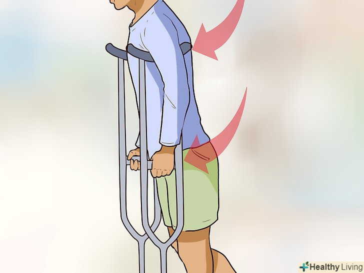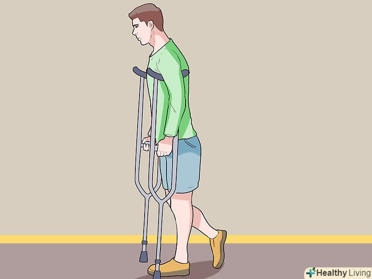 Використовуйте милиці, щоб допомагати собі при ходьбі.нахиліться вперед і поставте обидва милиці приблизно на 30 сантиметрів перед вами. Пересувайтеся так, ніби ви крокуєте з травмованою ногою, але спирайте свою вагу на рукоятки милиць. Подайте своє тіло вперед і поставте здорову ногу на землю. Щоб продовжити рух вперед, повторіть ці дії.[3]- Тримайте хвору ногу злегка зігнутою трохи позаду вашого тіла, на висоті декількох сантиметрів від землі, щоб вона не тягнулася.