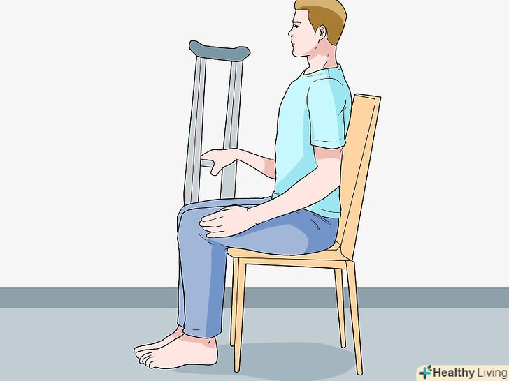 Використовуйте милиці, щоб сісти.знайдіть міцний стілець, який не від'їде назад, коли ви будете на нього сідати. Станьте до нього спиною і візьміть обидва милиці в одну руку, трохи спираючись на них і ставлячи хвору ніг перед собою. Зіпріться іншою рукою об стілець і опустіться на нього.- Притуліть милиці до стіни або до надійного стільця так, щоб пахви лежали внизу. Якщо ви притулите їх наконечниками вниз, то вони можуть перевернутися.[4]