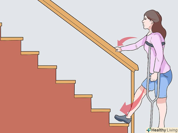 Коли ви піднімаєтеся по сходах, використовуйте свою здорову ногу в якості ведучої.Встаньте обличчям до сходинок і візьміться рукою за перила. Тримайте обидва милиці під пахвою з іншого боку. Зробіть крок здоровою ногою, утримуючи хвору ногу позаду. Зіпріться об милиці, зробіть наступний крок здоровою ногою і знову підніміть хвору ногу, утримуючи її ззаду.- В перший раз користуєтеся милицями на сходинках? Ви можете попросити товариша допомогти вам, оскільки зберігати рівновагу може бути спершу складно.