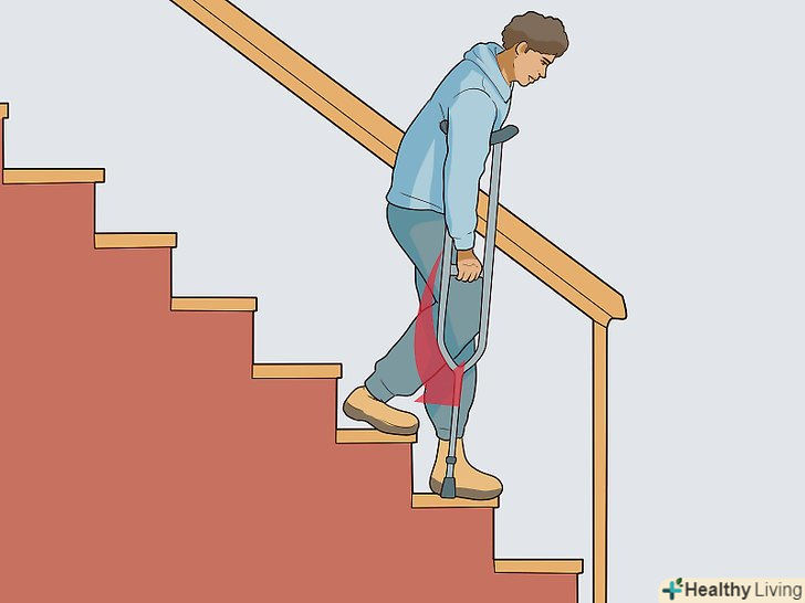 Спускайтеся сходами, утримуючи хвору ногою перед собою.Тримайте милиці під пахвою, утримуючись за перила іншою рукою. Обережно зістрибніть на наступну сходинку. Зістрибуйте на наступні сходинки, поки не спустіться вниз.- Якщо сходинки без поручнів, поставте милиці на сходинку нижче, спустіть хвору ногу, а потім зробіть крок вниз здоровою ногою, перемістивши свою вагу на рукоятки милиць.[5]