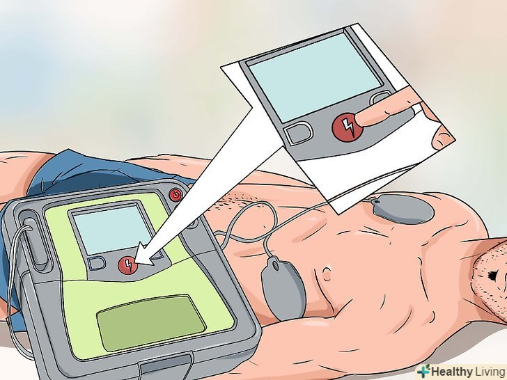 Вдарте потерпілого електричним розрядом, якщо необхідно.якщо на АВД буде написано, що потерпілого необхідно вдарити електричним розрядом, ще раз переконайтеся, що поруч з ним нікого і нічого немає. Після цього натисніть на потрібну кнопку на АВД. Пристрій подасть електричний розряд через електроди, щоб допомогти перезапустити серце.- За раз АВД дає тільки один електричний розряд, який триває зовсім недовго. У момент удару тіло потерпілого може вигнутися.[14]