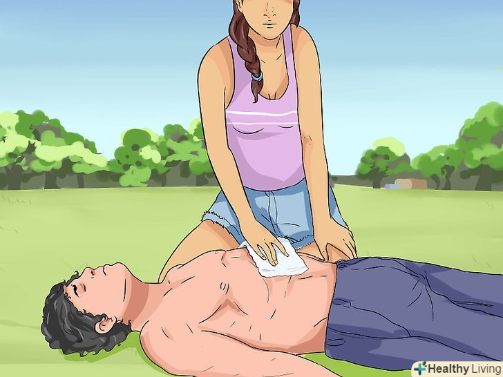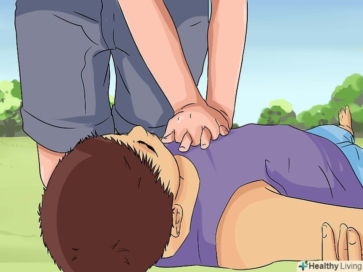 Приступите до реанімації потерпілого.якщо ви не одні, почніть реанімувати потерпілого, поки інша людина вирушила за АВД. Якщо поруч більше нікого немає, то спочатку зателефонуйте в швидку, а потім приступайте до реанімації.- Зробіть 30 компресій грудної клітини, а потім 2 штучних вдиху. Штучні вдихи не повинні тривати довше секунди. Постарайтеся уникнути гіпервентиляції і вдихайте стільки повітря, щоб у потерпілого піднімалася грудна клітка.
