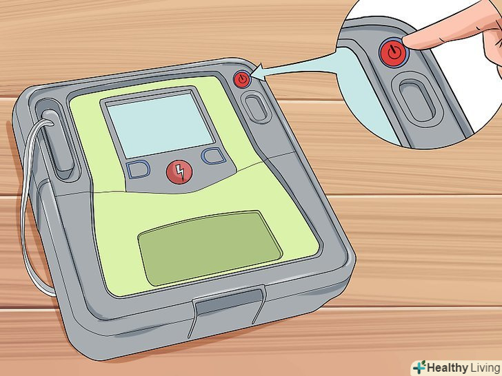 Увімкніть АВД.переконавшись у відсутності води, включіть АВД. Коли пристрій увімкнеться, на екрані відобразиться інструкція користування. В інструкції буде написано, як вставити дроти з електродами в пристрій. Як правило, їх просто потрібно вставити в роз'єми над миготливим індикатором вгорі пристрою.- Підключивши дроти, підготуйте потерпілого.[9]