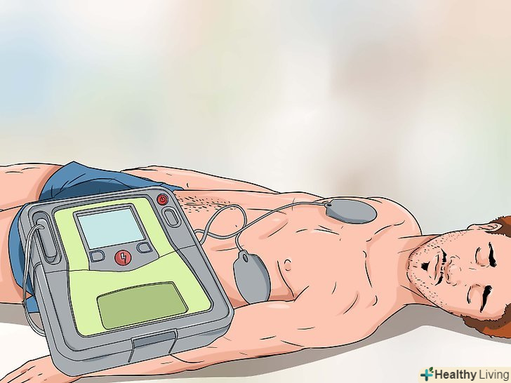 Закріпіть електроди.електроди являють собою клейкі подушечки. В інструкції до АВД буде сказано, що електроди або подушечки необхідно розмістити на тілі потерпілого. Переконайтеся, що вони знаходяться на правильних місцях, щоб потерпілий отримав максимально необхідний розряд. Одну подушечку необхідно приклеїти під ключицею в правій верхній частині грудей потерпілого, а другу — під грудними м'язами зліва, в нижній частині серця, уздовж боки.- Переконайтеся, що між подушечками і шкірою потерпілого немає тканини або іншого матеріалу, інакше АВД не спрацює.[11]