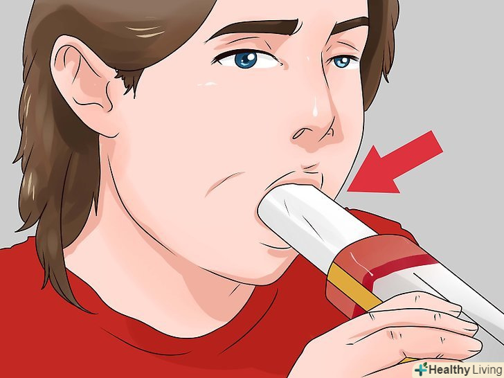 Помістіть мундштук в рот.щоб отримати правильні показання, слід помістити мундштук пікфлоуметра між передніми зубами і охопити його губами. Таким чином ви зафіксуєте прилад і запобіжите витік повітря повз нього при видиху.[7]- Посуньте язик назад, подалі від мундштука, щоб при видиху випадково не перекрити їм отвір приладу.