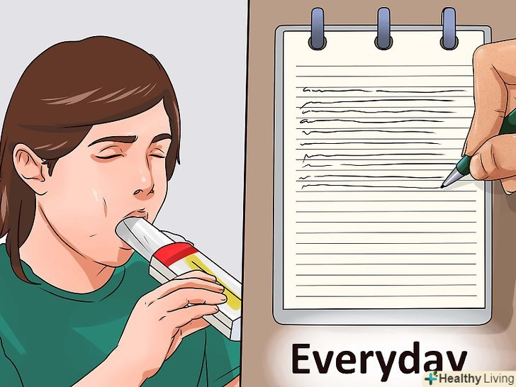 Ведіть щоденник.Таким чином ви зможете спостерігати за своїм станом і вчасно реагувати на напади астми. Записуйте в щоденник не тільки показання пікфлоуметра, а й додаткові відомості про свій стан, які можуть стати в нагоді згодом.[14]- Записуйте в щоденник щоденні показання пікфлоуметра і відзначайте при цьому час, максимальні показання приладу, можливі незвичайні відчуття і інші подробиці (наприклад, хрипи або запаморочення під час тесту).
