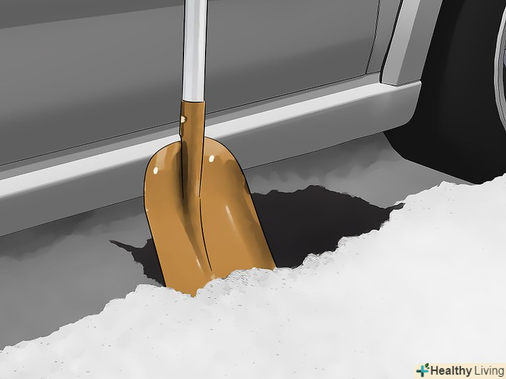 Відкопайте машину.візьміть лопату або аналогічний інструмент, щоб розчистити навколишній машину сніг. Постарайтеся прибрати сніг таким чином, щоб вам було видно всі чотири шини. Потім за допомогою викрутки або чогось подібного розбийте полій навколо шин. Будьте обережні, щоб випадково не проколоти шини.[1]- Видаліть якомога більше снігу.