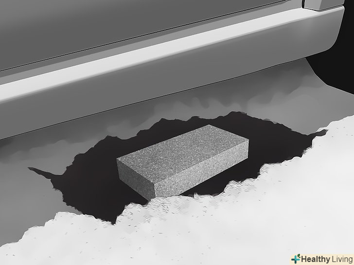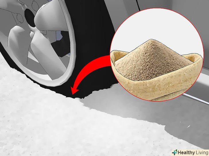 Посипте під колеса пісок або іншу зернисту субстанцію.насипте зернисту субстанцію перед, за і з боків від кожного колеса. Вона допоможе збільшити зчеплення з поверхнею, коли ви спробуєте рушити вперед або назад. Як зернистої речовини можна використовувати наступне:- Сіль, яка не тільки збільшить зчеплення шин з поверхнею, але і підтопить лід і сніг під ними;