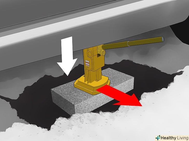 Розчистіть місце під домкрат.знайдіть відповідне місце для установки домкрата поруч з тим колесом, яке загрузло найсильніше. Максимально відкопайте колесо від пухкого снігу і льоду. Також розчистіть рівну і тверду поверхню для установки домкрата. Це місце повинно розташовуватися безпосередньо під монолітною металевою частиною днища, яку можна опереть на домкрат.[11]- У більшості машин є кілька точок для установки домкрата, які спеціально змодельовані, щоб витримувати навантаження. Зверніться до керівництва по вашому автомобілю, щоб дізнатися, де саме знаходяться ці точки.