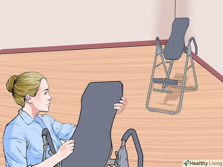 Встановіть інверсійний стіл на відкритій ділянці.інверсійні столи для домашнього використання відносно недорогі (від 12 до 40 тисяч рублів), і подібний стіл можна придбати в магазині медичного обладнання. Після того як ви доставите стіл додому, приготуйте для нього досить просторе місце, щоб не вдаритися об що-небудь головою або не отримати якесь інше пошкодження або травму. Краще поставити стіл на надійно закріплений килимок або мат, щоб він був стійкий і не ковзав по підлозі.- Подумайте над тим, щоб встановити інверсійний стіл в підвальному приміщенні, на горищі, в кімнаті відпочинку або гаражі — там, де навколо столу буде щонайменше півтора метра вільного простору.