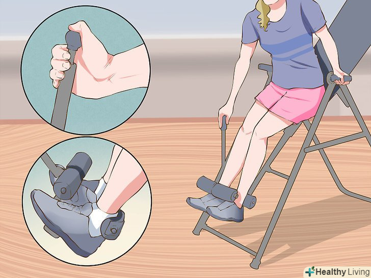 Не поспішаючи заберіться на стіл і зафіксуйте свої ступні.після того, як ви встановите відповідну висоту і кут нахилу, ляжте спиною на інверсійний стіл так, щоб ваш погляд був звернений до стелі. Після цього вам доведеться трохи піднятися і присісти для того, щоб зафіксувати ступні і щиколотки за допомогою ременів. Зручніше займатися не босоніж, а надіти зручне взуття. Потім підніміть руки над головою, випрямитеся і відхиліться назад, щоб стіл знову відкинувся під встановленим раніше кутом, і постарайтеся розслабитися в перевернутому положенні протягом запланованого часу.- Поки ви як слід не освоїте інверсійний стіл, попросіть кого-небудь допомагати вам і контролювати ваші дії, особливо в тому випадку, якщо ви маєте велику статуру, а ваші рухливість і гнучкість обмежені.