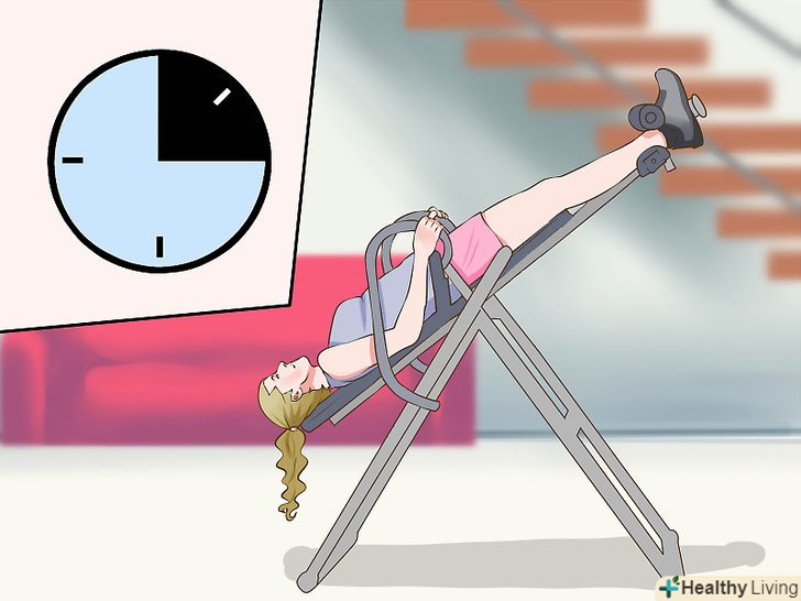 Поступово збільшуйте частоту і тривалість занять.визначте оптимальну для вас тривалість (а також найбільш підходящий кут нахилу) занять на інверсійному столі. Деяким достатньо по три 15-хвилинних сеанси в тиждень, в той час як інші вважають за краще більш часті і тривалі заняття. Головне, щоб це позитивно впливало на ваш стан. Як правило, не слід використовувати інверсійний стіл частіше 3 разів на день або лежати на ньому довше години за одне заняття. Оптимальні частота і тривалість сеансів визначаються безліччю факторів.[7]- Для початку проводите на інверсійному столі не більше 5 хвилин, навіть якщо при цьому ви відчуваєте себе нормально і не відчуваєте ніяких побічних ефектів. Можна поступово збільшувати час, проте негайно припиняйте сеанси, якщо відчуєте посилення болю в спині або прострілює біль в ногах (ішіас).[8]