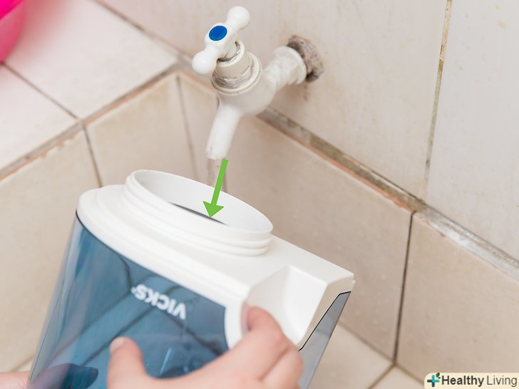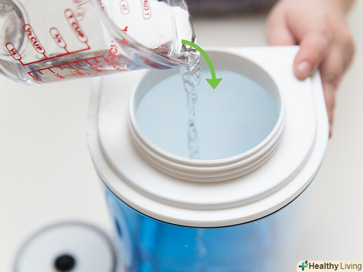 Наповніть ємність дистильованою водою.вода з-під крана містить мінеральні домішки, які можуть засмітити випарник або забруднити повітря в будинку.[6][7]- На більшості випарників позначений верхній рівень, до якого слід наливати воду. Не перевищуйте його, інакше вода може розбризкуватися.