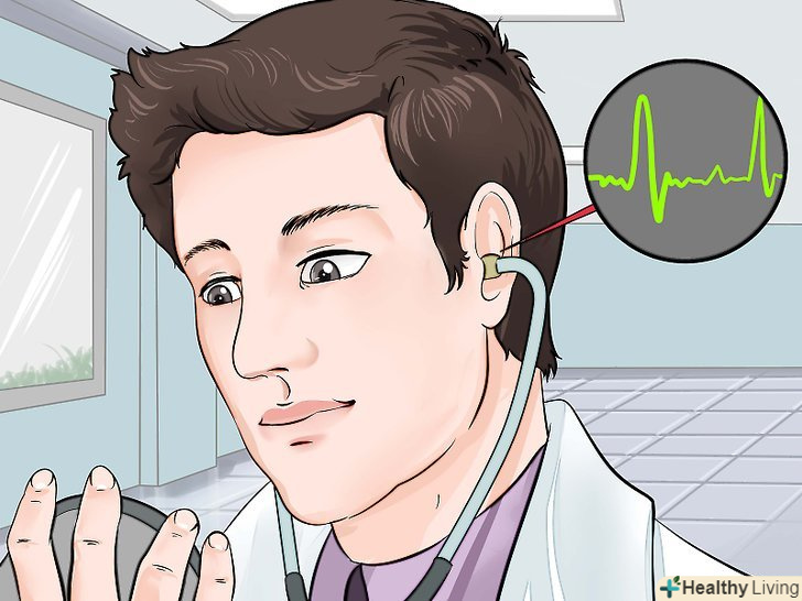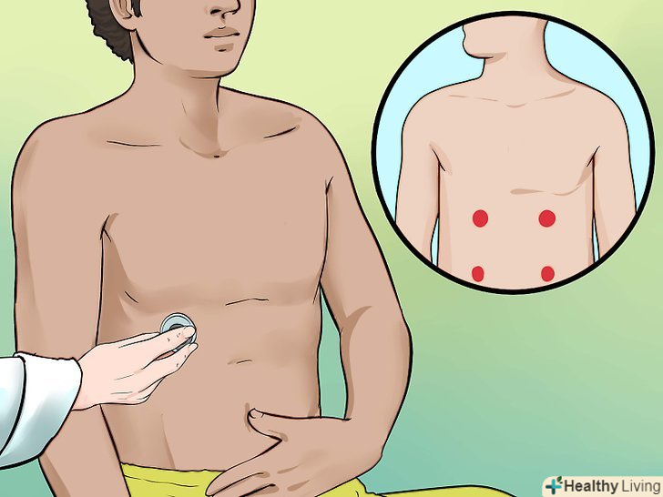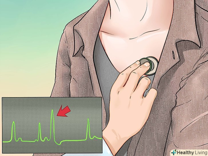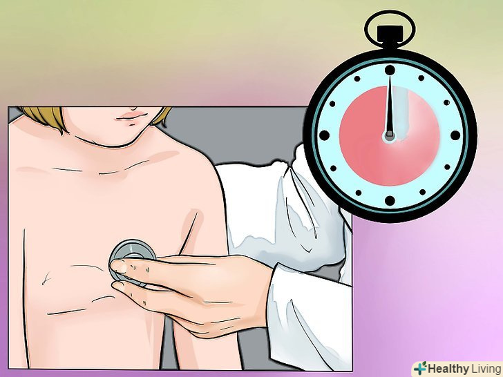 Прислухайтеся до ненормальних тонів серця.як тільки ви порахували пульсацію серця, вам слід ще прислухатися до будь-яких ненормальних звуків. Все, що звучить не як "тук-тук" , можна вважати ненормальним. Якщо ви чуєте щось ненормальне, вашому пацієнту потрібне подальше обстеження у лікаря. [24]- Якщо ви чуєте свистячий звук схожий на "тук ... шшш ... тук", у вашого пацієнта, можливо, серцевий шум. Серцевий шум-це кров швидко поточна через клапани. Багато людей мають так званий доброякісний серцевий шум.[25] але деякі серцеві шуми все ж вказують на проблеми з серцем, так що вам слід порадити пацієнту звернутися до лікаря, якщо ви виявите серцевий шум.[26]