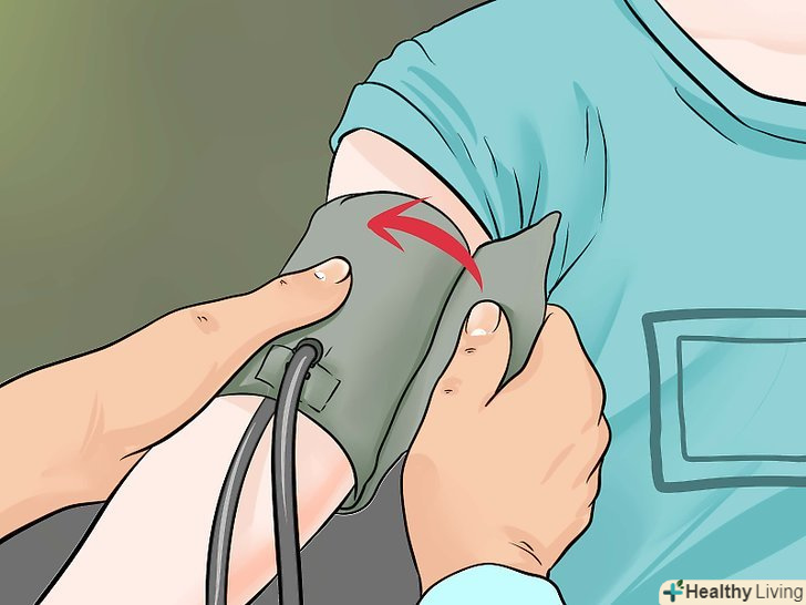 Оберніть манжетку для вимірювання кров'яного тиску навколо руки пацієнта прямо над ліктем.Закатайте рукав пацієнта, якщо він заважає.[48] переконайтеся, що манжетка для вимірювання кров'яного тиску, яку ви використовуєте, підходить руці пацієнта. Ви повинні зуміти обернути манжетку так, щоб вона щільно прилягала, але не дуже туго. Якщо манжетка для вимірювання кров'яного тиску занадто мала або занадто велика, дістаньте іншого розміру.[49]