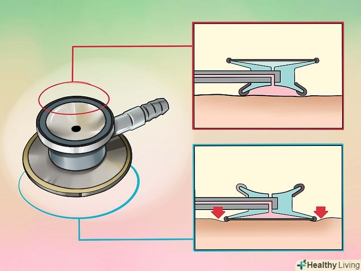 Визначте, чи будете використовувати діафрагму або дзвіночок.діафрагма, або плоска сторона насадки, краще підходить для вислуховування середньо - і високо-частотних звуків. Дзвіночок, або кругла частина насадки, краще підходить для вислуховування низько-частотних звуків.[13][14]- Якщо вам потрібен стетоскоп з дійсно високою якістю звуку, вам, можливо, потрібно подумати про електронний стетоскоп. Електронний стетоскоп забезпечує посилення, так що це полегшує вислуховування звуків серця і легенів. Використання електронного стетоскопа може полегшити вислуховування серця або легені вашого пацієнта, але враховуйте те, що вони дорогі.[15]