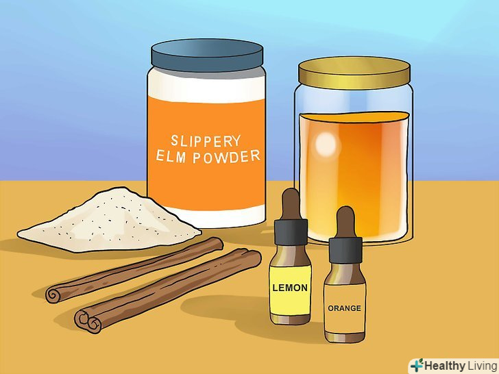 Підготуйте необхідні інгредієнти.в даному рецепті використовуються порошок в'яза іржавого, кориця, мед, апельсинове і лимонне ефірні масла.[24]- Кору в'яза іржавого і ефірні масла можна придбати в аптеці, магазині фітопрепаратів або органічних продуктів, або замовити через Інтернет.