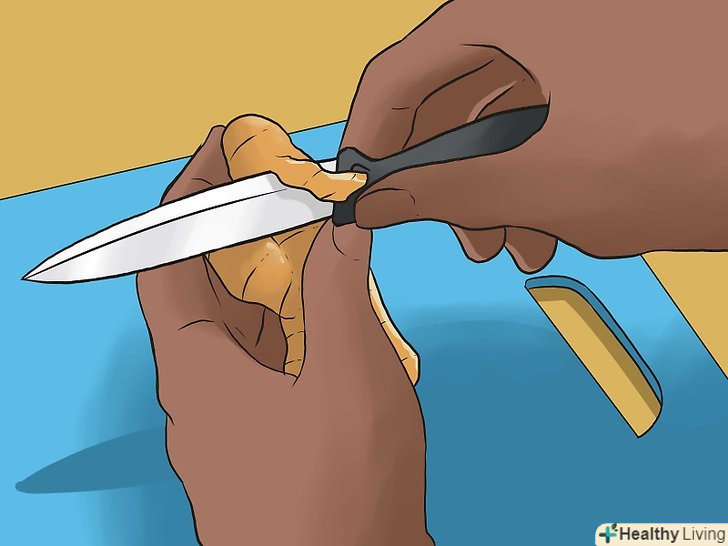 Підготуйте імбир і лимонну цедру.спочатку почистіть корінь імбиру ножем для чищення овочів або картоплечисткою.[5]- Свіжий імбир можна придбати в найближчому супермаркеті в овочевому відділі.