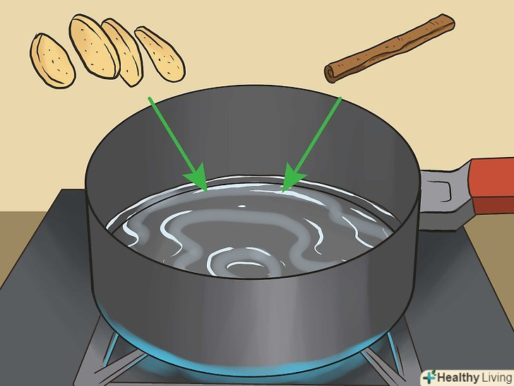 Покладіть скибочки імбиру і коричну паличку в каструлю і залийте їх 1,5 склянки (360 мілілітрах) води.доведіть суміш до кипіння на сильному вогні.[7]- Коли вода почне закипати, на її поверхню буде виходити постійний потік великих бульбашок газу, і почне утворюватися велика кількість пари.