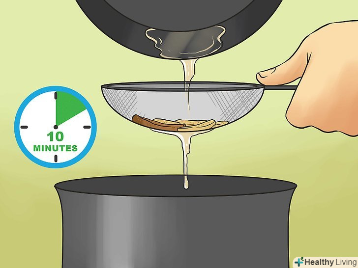 Кип'ятіть суміш 10 хвилин.потім дістаньте з каструлі імбир і коричну паличку.[8]- Найлегше дістати спеції за допомогою сита.