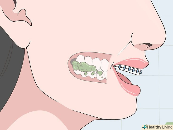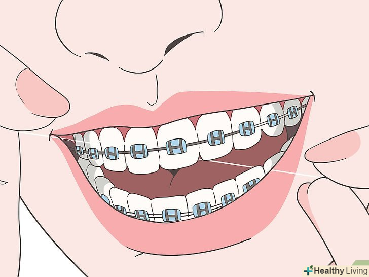 Регулярно користуйтеся зубною ниткою.користуватися зубною ниткою при встановлених брекетах досить важко, але помітно важливіше, ніж без них. Їжа сильніше накопичується навколо брекетів і між зубів, викликаючи дискомфорт і збільшуючи ризик розвитку інфекції. Такі засоби, як спеціальні нитковтягувачі зубної нитки або зубна нитка Super Floss, допоможуть вам без праці прочистити самі брекети і ділянки між зубів.[38]