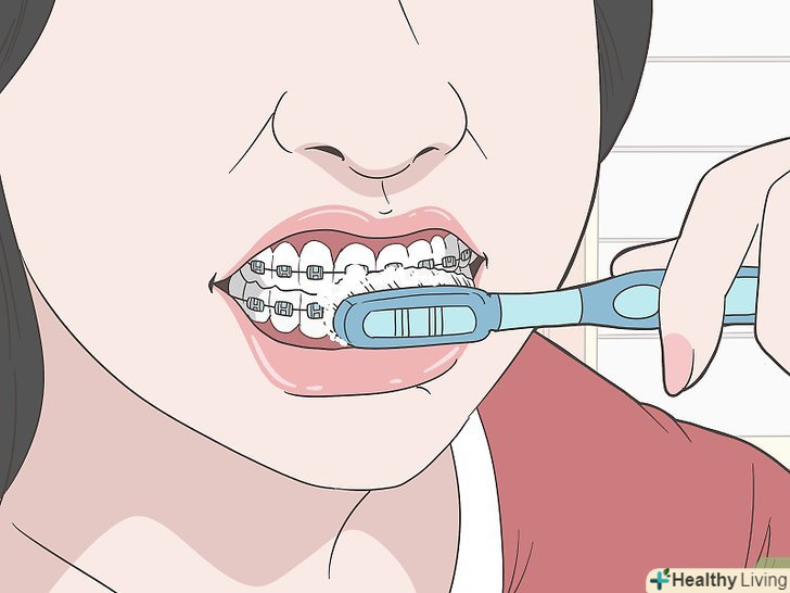 Чистіть зуби після кожного прийому їжі.коли у вас встановлені брекети, дуже важливо чистити зуби зубною щіткою, і це особливо важливо, якщо брекети були недавно встановлені або підтягнуті. Залишки їжі можуть викликати хворобливі відчуття в зубах і яснах. Якщо ви будете регулярно чистити зуби після кожного прийому їжі і перед сном, то захистіть їх від зайвого дискомфорту.[41]- Використовуйте зубну щітку з м'якою щетиною, щоб знизити больові відчуття в зубах і яснах від самого процесу чищення зубів.[42]
