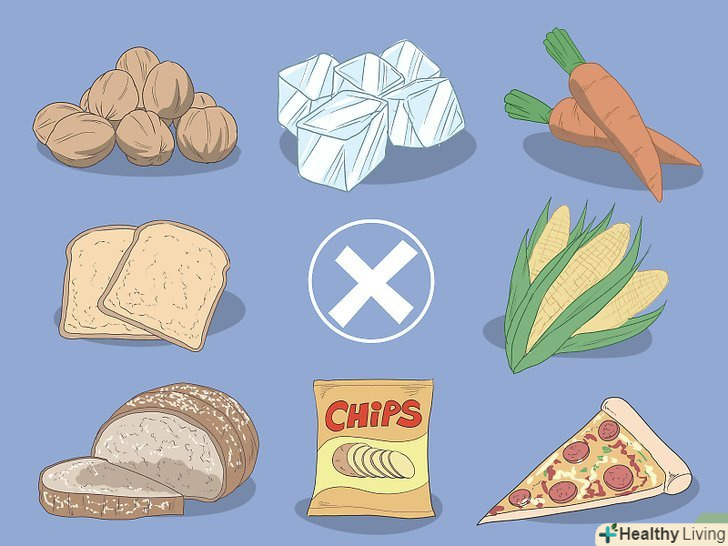 Уникайте вживання твердої їжі.тверда їжа може призводити до різних поломок брекетів, також через неї в наступні кілька днів після установки або підтяжки брекетів можуть виникати помірні і сильні больові відчуття.[3] уникайте всього твердого і хрусткого, особливо незабаром після візиту до стоматолога-ортодонта. Зазвичай рекомендується утриматися від нижчезазначених видів їжі (проте, даний список неповний):- Від будь-яких горіхів[4];