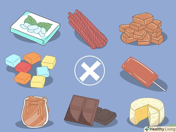 Виключіть з харчування в'язку їжу.В'язка їжа погано позначається на стані брекетів і може викликати больові відчуття, якщо ви вирішите з'їсти щось подібне незабаром після установки нових брекетів. Цукерки і жувальні гумки – найгірші приклади такої їжі, тому від них слід відмовитися.[16] зазвичай з новими брекетами рекомендують утриматися від нижчезазначених видів їжі: