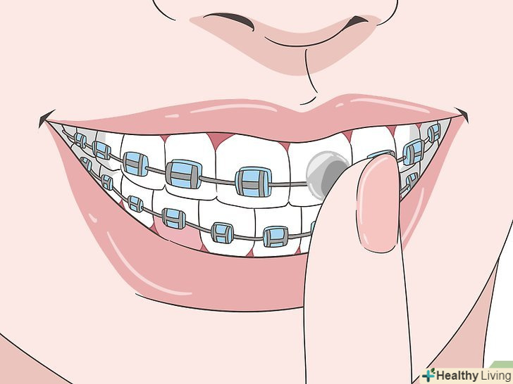 Використовуйте ортодонтичний віск для гострих частин брекетів.багато людей відчувають больові відчуття в період звикання губ, щік і мови до контакту з металевими брекетами. У деяких випадках м'які тканини може періодично колоти зволікання від брекетів. І те, і інше абсолютно нормально, а зняти виникаючі больові відчуття можна за допомогою ортодонтичного воску, що наноситься на самі брекети або дріт в місцях, які викликають біль і дискомфорт. Віск досить корисний в період звикання ротової порожнини до брекетів, а також в якості тимчасового рішення в разі поломки брекетів, поки вам не вдасться потрапити на прийом до стоматолога-ортодонта. Однак запам'ятайте, якщо у вас поламався один з брекетів або почала незручно стирчати дріт, розумно буде звернутися до ортодонта якомога швидше, щоб належним чином виправити проблему.[34]- Використовуйте з брекетами тільки ортодонтичний віск. Його Вам відразу може видати стоматолог-ортодонт, також його можна придбати самостійно в найближчій аптеці.[35]