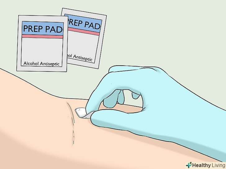 Очистіть місце ін'єкції медичним спиртом, після того як знайдете відповідну вену.перш ніж робити ін'єкцію, необхідно очистити шкіру в місці уколу. Коли Ви відшукаєте відповідну вену, протріть місце ін'єкції серветкою для ін'єкцій, просоченої ізопропіловим спиртом.[8]- Якщо у вас немає спеціальних серветок для ін'єкцій, змочіть ізопропіловим спиртом стерильний ватяну кульку і протріть їм шкіру.