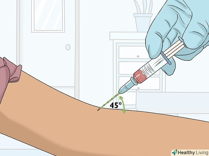 Вставте голку в вену на руці під кутом 45 градусів.візьміть підготовлений стерильний шприц і обережно вставте кінчик голки в вену в тому місці, куди ви хочете зробити ін'єкцію. Вставте голку таким чином, щоб ввести ліки в напрямку кровотоку. Оскільки вени доставляють кров до серця, введіть ліки у напрямку до нього. При цьому шприц повинен бути спрямований вгору.[9]- У разі будь-яких сумнівів або питань щодо правильного розташування голки проконсультуйтеся з кваліфікованим лікарем або медсестрою, перш ніж вводити ліки в вену.