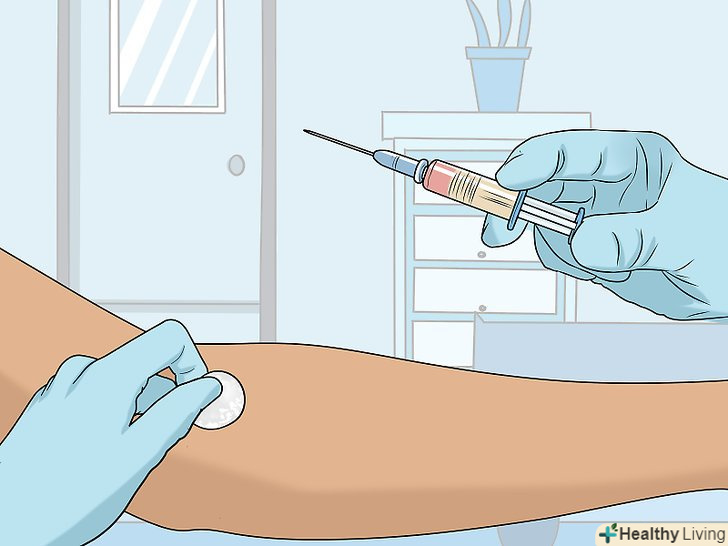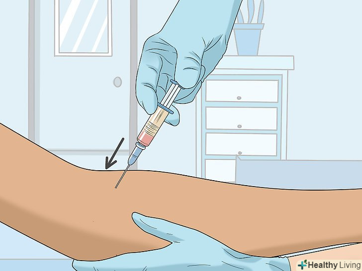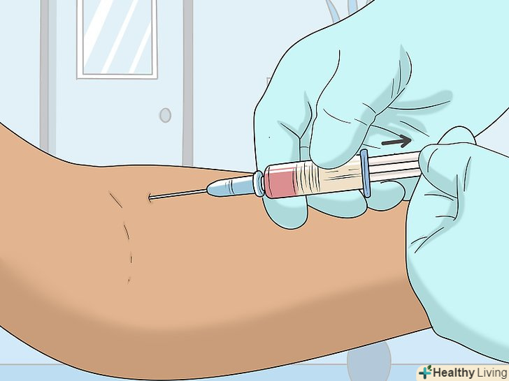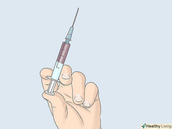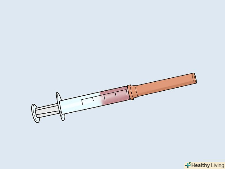 Відтягніть назад поршень шприца, щоб переконатися, що голка знаходиться у вені.обережно відтягніть поршень трохи назад і перевірте, чи зайшла в шприц кров. Якщо в шприц не проникла кров, ви не потрапили в вену, і в цьому випадку необхідно вийняти голку і спробувати ще раз. Якщо ж в шприц зайшла темно-червона кров, ви успішно потрапили в вену і можете продовжувати далі.[10]- Якщо кров заходить в шприц під помітним тиском, має яскраво-червоний колір і піниться, значить, ви вставили голку в артерію. Негайно витягніть голку і прикладайте до місця уколу тиск протягом хоча б 5 хвилин, щоб зупинити кровотечу. Будьте особливо обережні, якщо ви потрапили в плечову артерію на внутрішній стороні ліктя, так як витекла з неї кров може порушити нормальне функціонування кисті руки. Спробуйте ще раз з новою голкою після того, як зупиніть кровотечу.[11]