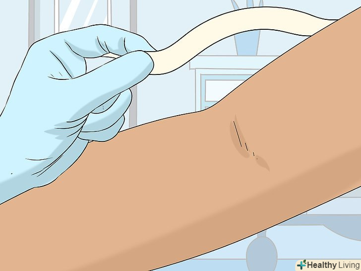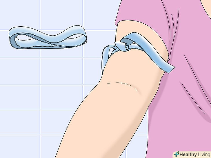 Оберніть навколо руки джгут, щоб Вена краще виступила. оберніть руку еластичним джгутом на 5-10 сантиметрів вище місця ін'єкції. Зауважте джгут вільним вузлом або просто закріпіть його кінці бинтом. Якщо ви збираєтеся зробити ін'єкцію у внутрішню частину ліктя, накладіть джгут вище біцепса, а не на сам біцепс.- Джгут повинен легко зніматися. Ні в якому разі не використовуйте ремінь або нееластичну тканину, так як це призведе до спотворення форми вен.[3]