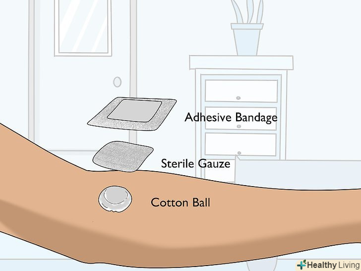 Перев'яжіть місце уколу.накрийте місце ін'єкції свіжим стерильним бинтом і закріпіть його на місці за допомогою лейкопластиру або липкого бинта. Це допоможе зберегти тиск на місце уколу після того, як ви приберете палець з бинта або шматочка вати.- Ін'єкцію можна вважати завершеною після того, як ви перев'яжете місце уколу.