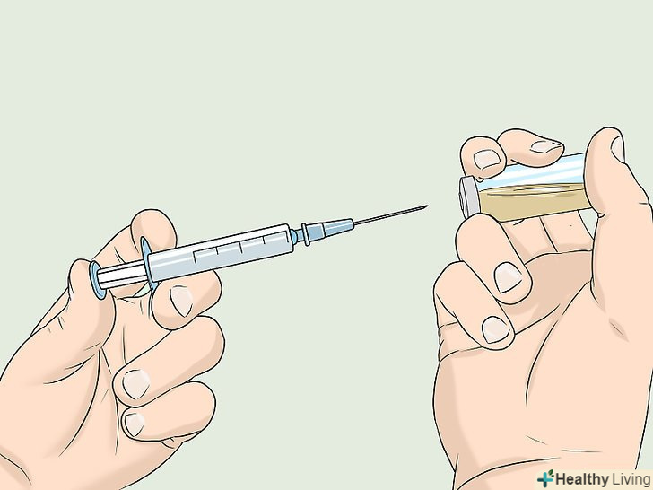 - Вставте голку шприца в пляшечку з ліками і відтягніть поршень. Візьміть чистий невикористаний шприц і вставте голку в ампулу з препаратом. Відтягніть поршень і наберіть в шприц необхідну дозу. Наберіть точно ту кількість ліки, яке призначив лікар. Не перевищуйте дозу і не набирайте менше, ніж наказано. Дотримуйтесь також всі додаткові інструкції лікаря щодо правильної підготовки ліки.[18]