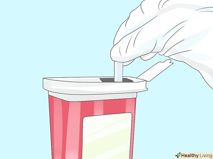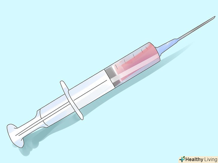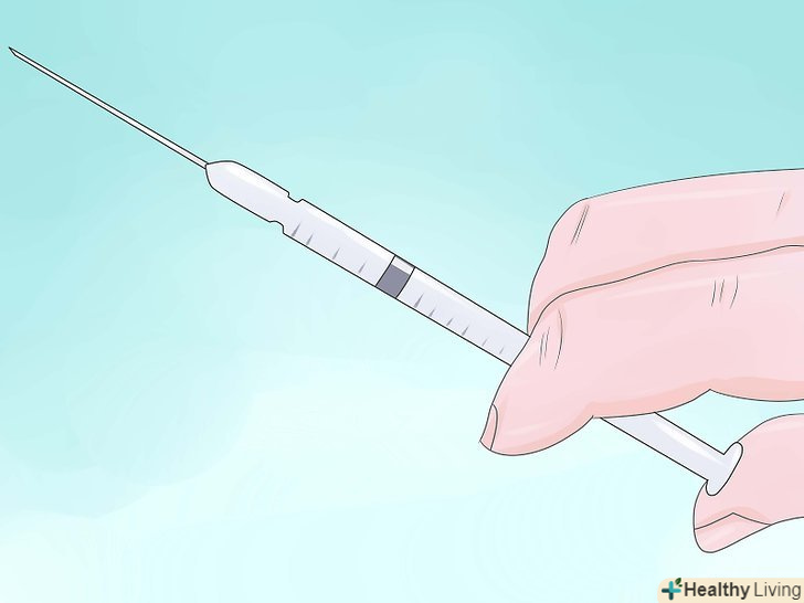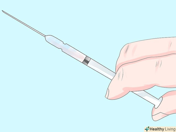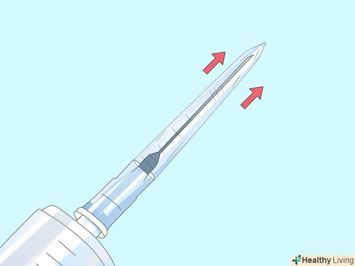 Тримайте шприц вертикально і зніміть ковпачок з голки.обережно тримайте шприц (голкою вгору) однією рукою. Іншою рукою потягніть сірий ковпачок вгору і в сторону від шприца. Після того, як ви знімете ковпачок, будьте дуже обережні, щоб не впустити шприц і уникнути зараження.[7]
