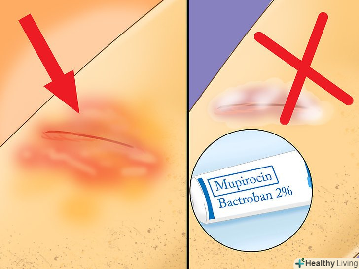 Оцініть свій стан через 3-5 днів.огляньте шкіру на наявність фізичних ознак поліпшення. Якщо ви не бачите жодних змін або стан інфекції погіршився, негайно зверніться до лікаря. Це може говорити про те, що ваша інфекція несприйнятлива до мупіроцину, а значить, Бактробан вам не допоможе.[8][9]- Швидше за все, через 3-5 днів інфекція не пройде повністю, але до цього часу вже повинні бути якісь видимі поліпшення.
