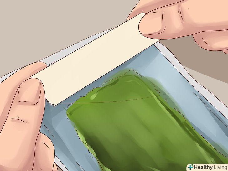 Оберніть припарку і закріпіть її лейкопластиром.прикривши траву пакувальною плівкою, оберніть тканину і плівку лейкопластиром, щоб вийшов маленький, міцний пакет. Медичним лейкопластиром зафіксуйте краю, щоб вийшов плоский, непроникний, закритий з усіх боків пакетик.- Якщо витече трохи рідини, це не страшно, але пакет не повинен сильно протікати. Він повинен бути схожий на пакетик чаю, занурений у воду, а потім віджатий.