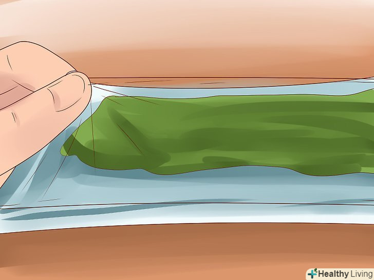 Прикрийте траву плівкою.щоб суміш залишалася чистою і вбиралася в потрібному напрямку, її зазвичай накривають зверху шаром харчової плівки. Це буде "задня частина" припарки, спрямована в протилежну сторону від шкіри і рани.- Відріжте невеликий шматок харчової плівки і прикрийте їм траву, утрамбувавши її по краях. Не натискайте занадто сильно, інакше ви вичавіть всю рідину з суміші.