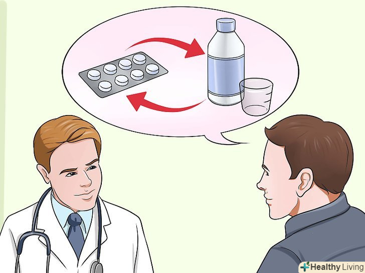 Проконсультуйтеся з лікарем щодо того, щоб змінити режим прийому медикаментів або перейти на інші ліки.розкажіть лікарю, як часто у вас трапляються викликані ліками напади нудоти і наскільки вони сильні. Лікар зможе змінити розклад прийому препарату і його дозування, або призначить вам інші ліки зі схожим дією.[10] нічого не змінюйте самостійно, без попередньої консультації з лікарем.- Заміна таблеток рідким розчином може значно знизити нудоту, особливо якщо при ковтанні таблеток або капсул пацієнт відчуває блювотний рефлекс.
