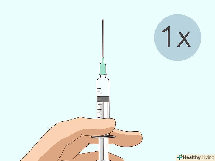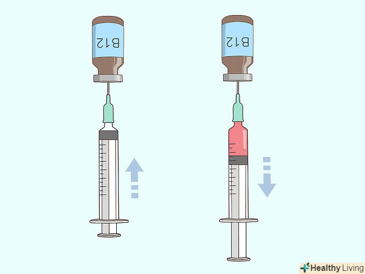 Вийміть голку з флакона.натисніть злегка на поршень, щоб видавити невелику кількість вітаміну B12 і переконатися, що в шприці не залишилося повітря. [13]