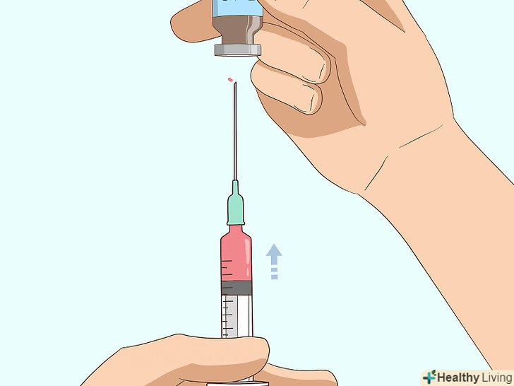 Відтягніть поршень шприца, щоб набрати потрібну кількість вітаміну для ін'єкції.потім вставте його у флакон. Виштовхніть зі шприца повітря, натиснувши на поршень, а потім повільно відтягуйте поршень, поки в шприц не набереться потрібну кількість розчину.[12]- Злегка постукайте пальцем по шприцу, щоб видалити з нього бульбашки повітря.