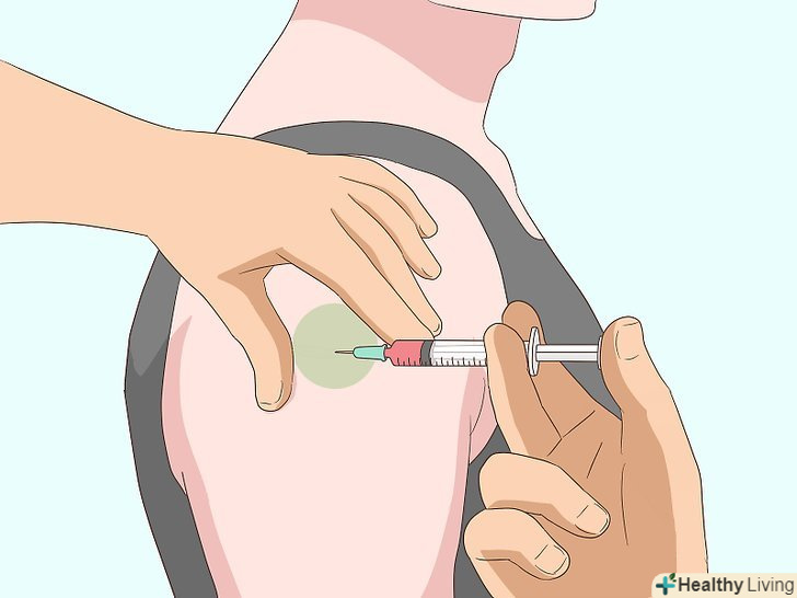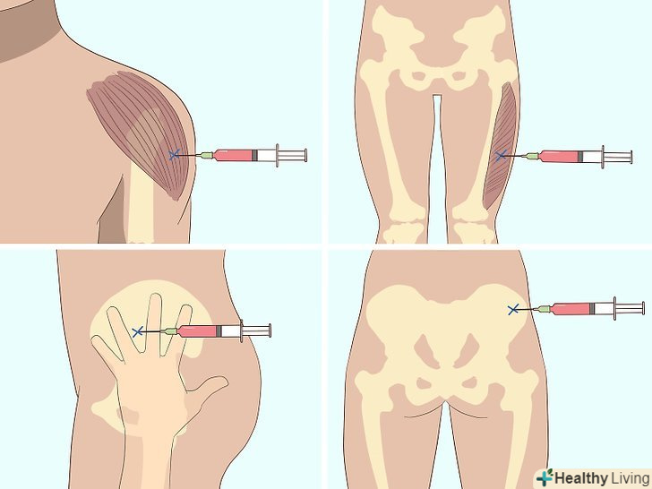Виберіть місце для ін'єкції.оптимальне місце для введення препарату залежить від вашого віку і практичних навичок людини, що робить ін'єкцію. Існує чотири основні місця для ін'єкцій: [8]- Плече. Це місце часто використовують люди молодого або середнього віку. Літні люди можуть вибрати Це місце, якщо у них добре розвинені дельтовидні м'язи плеча. Однак якщо доза перевищує 1 мл, то її не слід вводити в плече.
