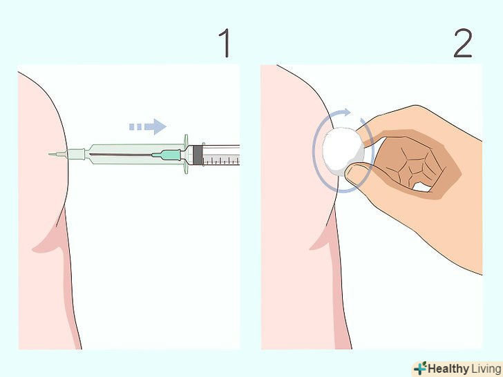 Відпустіть шкіру і витягніть голку.витягайте під тим же кутом, що і вводили. Промокніть місце ін'єкції ватним тампоном, щоб очистити його і зупинити кровотечу.- Протріть місце ін'єкції круговими рухами.