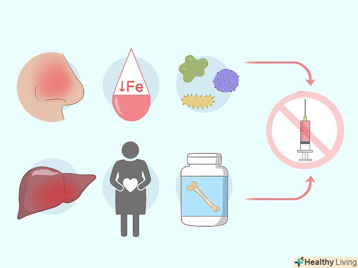 Дізнайтеся про можливі ускладнення від ін'єкції вітаміну B12.оскільки ін'єкція вітаміну В12 містить ціанокобаламін, ви не повинні вводити цей препарат, якщо у вас алергія на ціанокобаламін або кобальт, або хвороба Лебера, яка є спадковою формою втрати зору. Перш ніж лікар випише вам рецепт на ін'єкції вітаміну B12, повідомте йому про будь алергії або будь-якому можливому захворюванні. Повідомте лікаря, якщо у вас: [5]- Симптоми алергії або застуди, які проявляються закладеністю носових пазух або чханням;