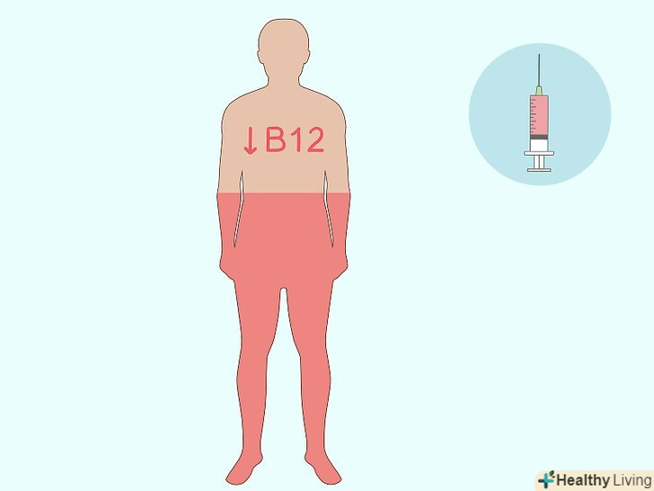 Розберіться, яка може бути користь від ін'єкцій вітаміну B12.якщо ви страждаєте від анемії або дефіциту вітаміну B12, то в якості лікування вам, ймовірно, необхідний вітамін B12 в ін'єкціях. У деяких людей вітамін B12 погано всмоктується з їжі або препаратів вітаміну B12 для перорального прийому, тому їм доводиться вдаватися до ін'єкцій цього вітаміну. Вегетаріанцям, які не вживають продукти тваринного походження, можуть допомогти зберегти здоров'я харчові добавки, що містять вітамін B12.[6]- Однак майте на увазі, що немає медичних підтверджень ефективності вітаміну B12 в боротьбі із зайвою вагою.[7]