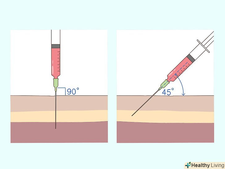 Виберіть спосіб введення ін'єкції. На перший погляд, зробити ін'єкцію за допомогою голки і шприца з усім не складно, проте існує два ін'єкційних методу, якими можна скористатися для введення вітаміну B12: [9]- Внутрішньом'язові ін'єкції. Ці ін'єкції є більш поширеними, оскільки вони, як правило, дають кращі результати. Голку вводять під кутом в 90 градусів, так що вона глибоко входить в м'язову тканину. Коли вітамін В12 вводять через голку, він негайно поглинається навколишніми м'язами. Завдяки цьому весь вітамін B12 абсорбується в організмі.