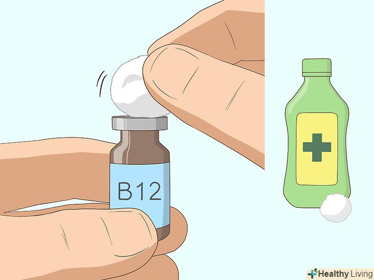 Очистіть поверхню розчину B12.змочіть в спирті новий ватний тампон, щоб протерти поверхню ємності з розчином B12.- Дайте висохнути.