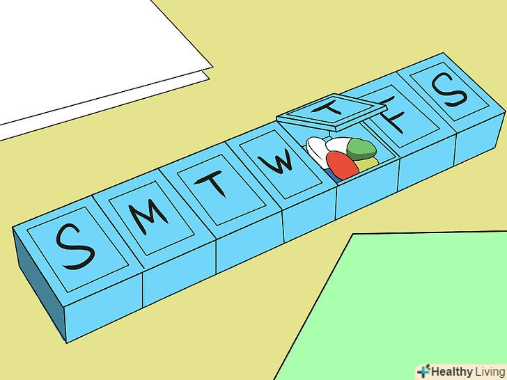 Купуйте спеціальну коробку для ліків, розділену на сім днів тижня.у багатьох аптеках продаються такі коробки. Коробка повинна мати відділення для кожного дня тижня. Деякі коробки мають кілька відділень для кожного дня тижня, зазвичай вона розділені на чотири відділення: ранок, день, вечір і час перед сном.- Якщо ви не в змозі самі стежити за такими речами або у вас немає фізичної можливості робити це, то попросіть кохану людину купити таку коробочку для вас і заповнити її.